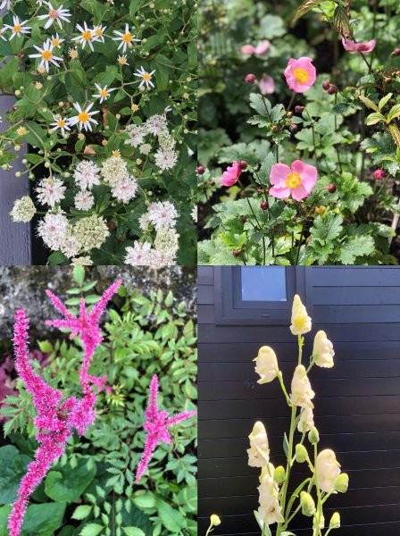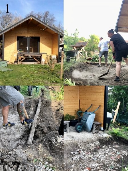 Die Fläche wurde bis zu 60 cm Tiefe ausgegraben, mit ca. 6 Tonnen Frostschutzkies und 2 Tonnen Feinsplitt aufgefüllt und dann mit den Terrassenplatten vollendet. Die Pächter haben die Materialien vom Kieswerk mit dem eigenen PKW und einem geliehenen Anhänger herangeschafft, alleine dafür waren viele Stunden erforderlich. Nachdem der Fugensand noch eingebracht wurde, lädt das Ergebnis zum Verweilen und Ausruhen ein. Auch hinter dem Häuschen ist es bereits richtig schön: Der Weg ist mit Basaltsplitt belegt und im Staudenbeet wachsen Funkien, Purpurglöckchen, Sternmoos und viele weitere Stauden, die sich mit ihrer Blütezeit ergänzen und abwechseln.